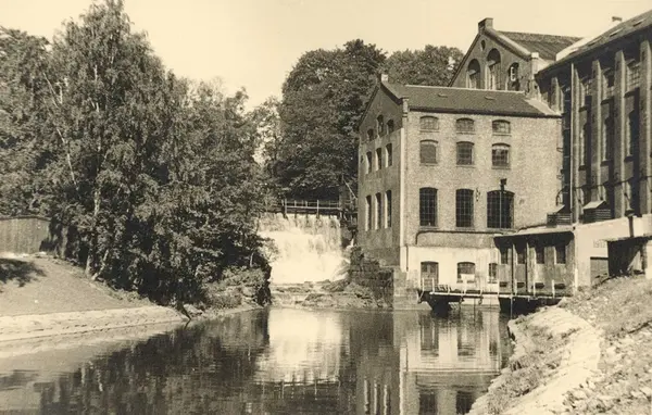 Album fra Christiania Seildugsfabrik. Fabrikkbygninger, elva og fossen.