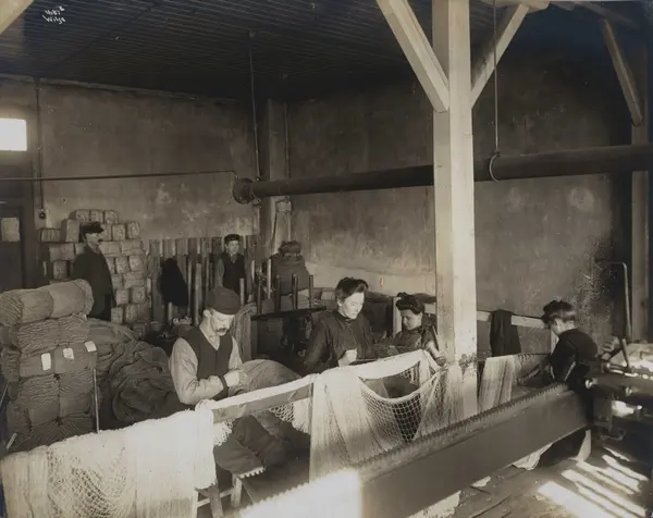 Fortex A/S. Christiania Seildugsfabrik, Oslo. Arbeidere fremstiller nett/garn.