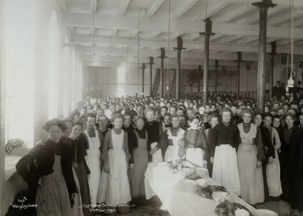 Fortex A/S. Christiania Seildugsfabrik, Oslo. Rom fullt av tekstilarbeidere bak koldtbord.