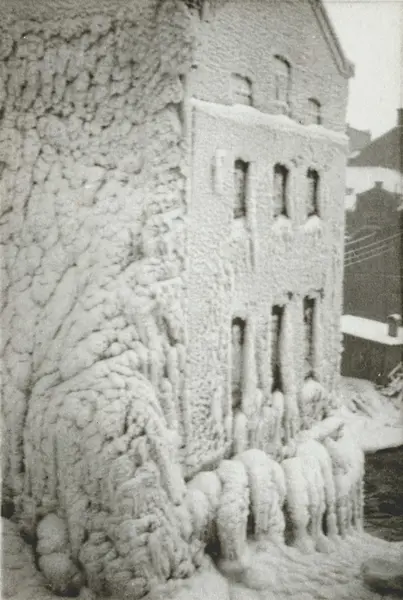 Fortex A/S. Christiania Seildugsfabrik. Fabrikkbygninger, elva og fossen. Vinter og nediset.