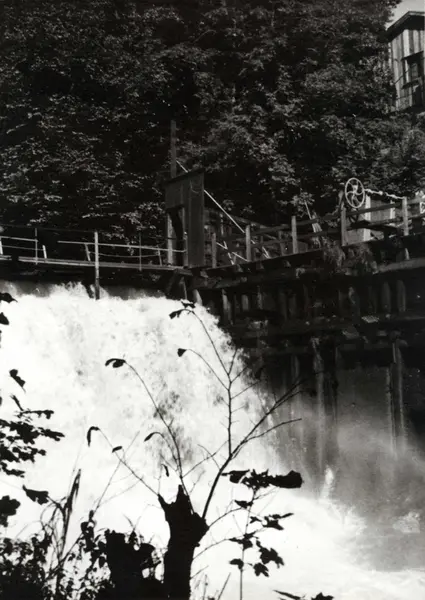 Fortex A/S. Christiania Seildugsfabrik. Fabrikkbygninger, elva og fossen. Vinter.