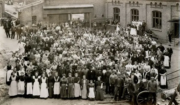 Personalalbum fra Christiania Seildugsfabrik, påbegynt i 1956. Arbeidere og funksjonærer på gårdsplassen i 1878.