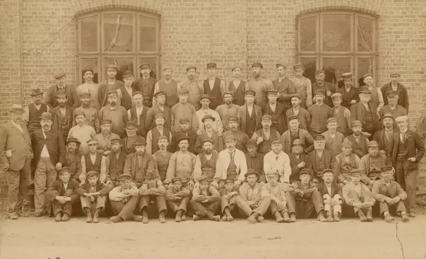 Personalalbum fra Christiania Seildugsfabrik, påbegynt i 1956. Fabrikkens mannlige arbeidere på gårdsplassen i 1878.