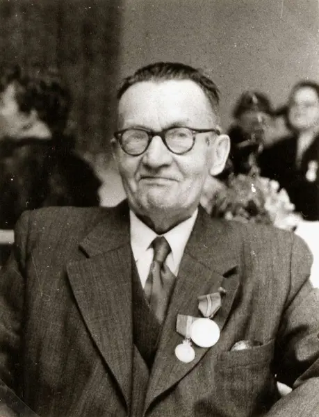 Personalalbum fra Christiania Seildugsfabrik, påbegynt i 1956. Portrett av snekker Sigurd Röhne. Født 01.07.1879. Ansatt 1891. Pensj. 1949.