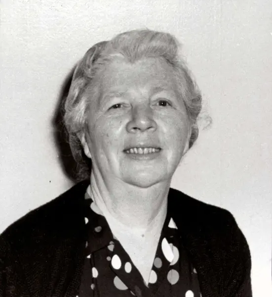 Personalalbum fra Christiania Seildugsfabrik, påbegynt i 1956. Portrett av Jenny Olsen, tvinneriet. Født 22.02.1886. Ansatt 1907. Pensj. 1948.