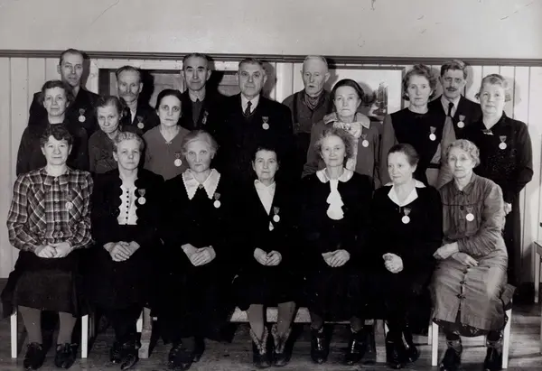 Personalalbum fra Christiania Seildugsfabrik, påbegynt i 1956. Gruppebilde av arbeidere og funksjonærer som har fått Norges Vels medalje i 1943.