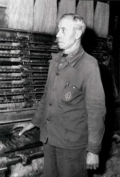 Personalalbum fra Christiania Seildugsfabrik, påbegynt i 1956. Portrett av hekleriformann Elias Krogeide. Født 22.10.1890. Ansatt 19.09.1905. 52 års tjeneste 19.09.1957. Formann fra 08.05.1916.