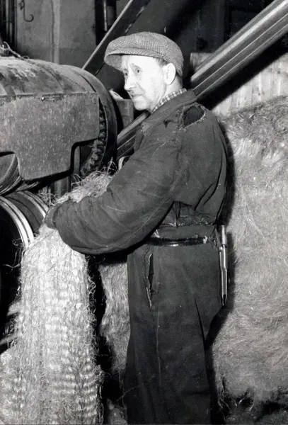 Personalalbum fra Christiania Seildugsfabrik, påbegynt i 1956. Portrett av Jørgen Nordby som skjærer hamp Født 18.06.1899. Ansatt 10.08.1917. 40 års tjeneste 10.08.1957. Pensjonert 10.02.1957.