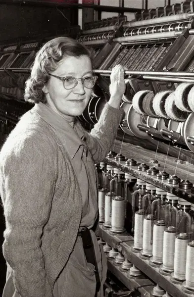 Personalalbum fra Christiania Seildugsfabrik, påbegynt i 1956. Portrett av Doris Olsen spinner hampegarn. Født 30.06.1907. Ansatt 26.06.1924. 32 års tjeneste 1957.
