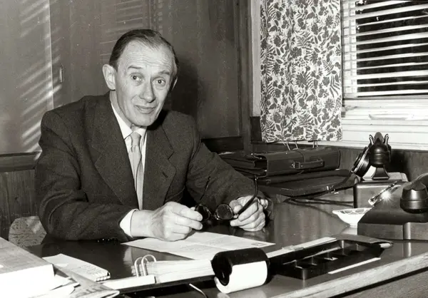 Personalalbum fra Christiania Seildugsfabrik, påbegynt i 1956. Portrett av salgssjef Ole Aagaard. Født 13.04.1899. Ansatt 25.04.1927. 30 års tjeneste i 1957. Salgssjef fra 01.01.1940.