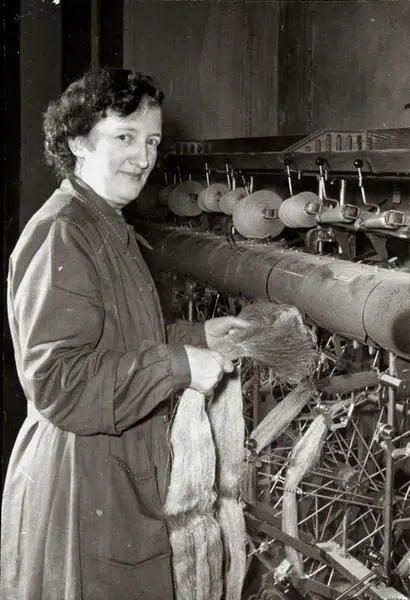 Personalalbum fra Christiania Seildugsfabrik, påbegynt i 1956. Portrett av Nancy Johansen som spoler lingarn. Født 22.01.1919. Ansatt 07.05.1929. 28 års tjeneste.