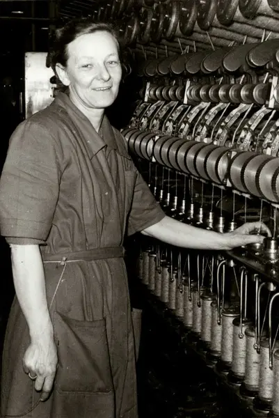 Personalalbum fra Christiania Seildugsfabrik, påbegynt i 1956. Portrett av Borghild Marthinsen som spinner jutegarn. Født 27.11.1911. Ansatt 12.02.1925. 26 års tjeneste.