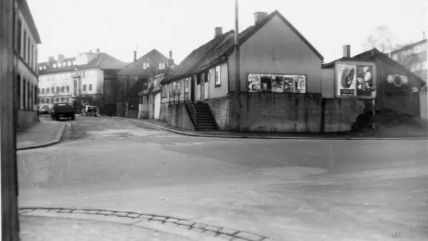Villa Enerhaugen i Smedgata 30, ved Sørli Plass. Bebyggelse og gatemiljø i Oslo, antakelig fotografert på 1950-tallet. Reklameplakater på husvegger.