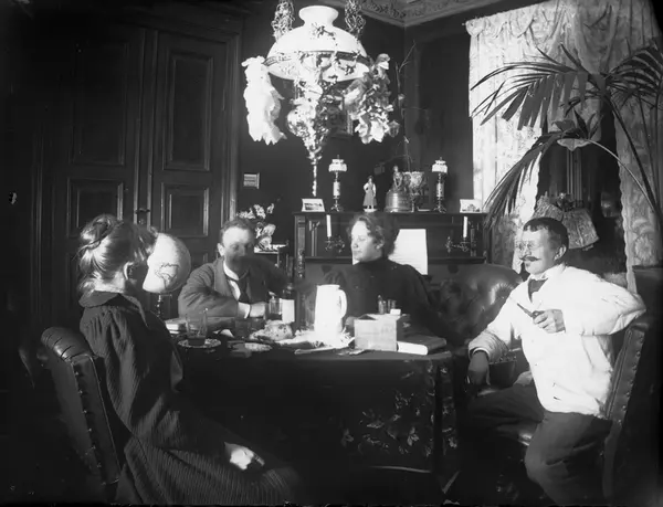 Stueinteriør, Munkedamsveien 65B, Oslo. Mennesker sitter rundt bord, 1903. Gudrun Q. Wiborg, Axel Q. Wiborg, Edle Thoresen, advokat H.J. Schwartz.