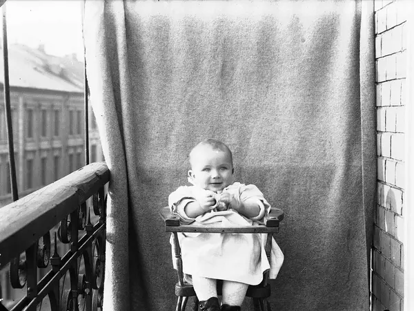 Lillebror Axel Q. Wiborg i barnestol på balkong, ant. Meltzers gate 9, Oslo, 1899. Fotografert mot opphengt bakteppe.