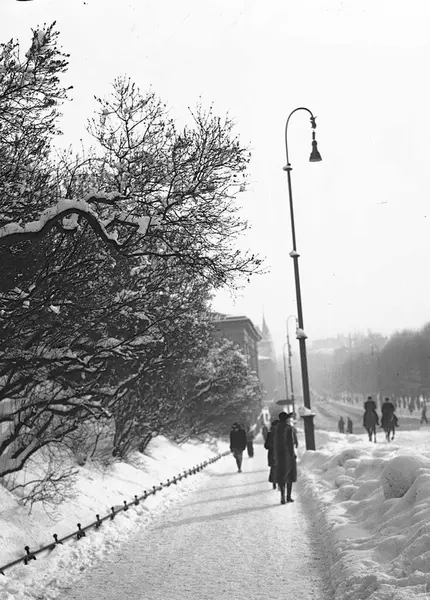 Vinterbilde fra Slottsbakken mot Karl Johans gate, Oslo.