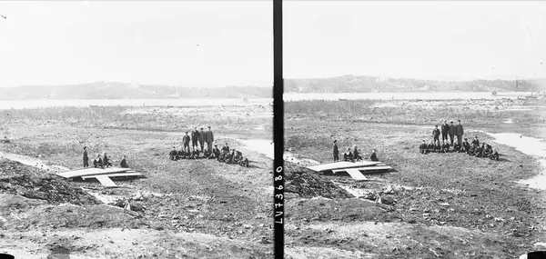 Fyllingen (?) med Oscarshall, Bygdøy, Oslo, i bakgrunnen, 1899. Gruppe i åpent landskap.