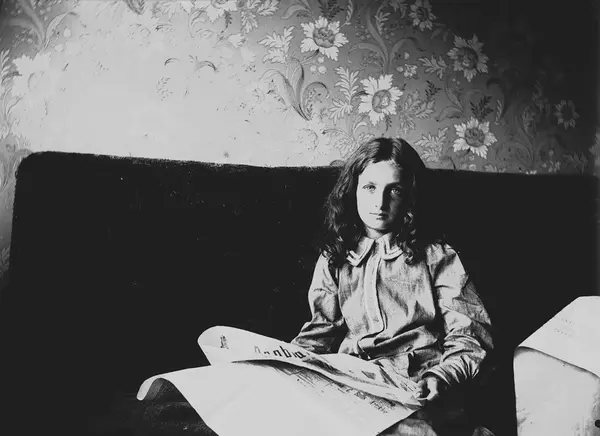 Karen Q. Wiborg leser avisen.i sofa, Prinsens gate 23, Oslo, 1906.