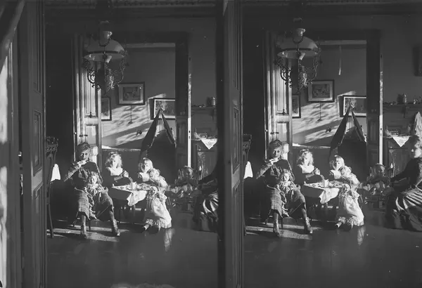 Interiør, barn i familien Wiborg leker dukkeselskap i Meltzers gate 9, Oslo, 1899.