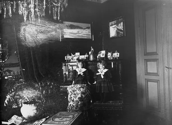 Karen og Gudrun Q. Wiborg sitter på piano i stue, Meltzers gate 9, Oslo, 1899. Fotografier i ramme plassert på pianoet.
