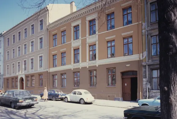 To bygårder, Fossveien 5 og 7 på Grünerløkka i Oslo, som er utbedret i regi av Oslo kommune med Oslo Byfornyelse A/S som gjennomføringsorgan. Arkitekt Truls Thorenfeldt A/S. Fotografert for Bonytt 1982.