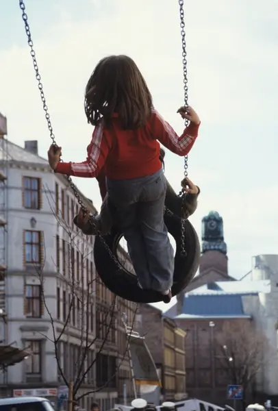 Barn på huske av bildekk. Bildet er antagelig tatt i forbindelse med en artikkel om byfornyelse på Grünerløkka i Oslo. Fotografert for Bonytt 1982.