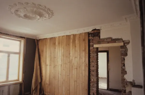 Rom under rehabilitering i bygård i Oslo. Bildet er antagelig tatt i forbindelse med en artikkel om byfornyelse på Grünerløkka i Oslo. Fotografert for Bonytt 1982.