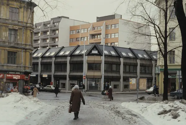 Ny bebyggelse i gammel bydel i Oslo. Bildet er antagelig tatt i forbindelse med en artikkel om byfornyelse på Grünerløkka i Oslo. Fotografert for Bonytt 1982.