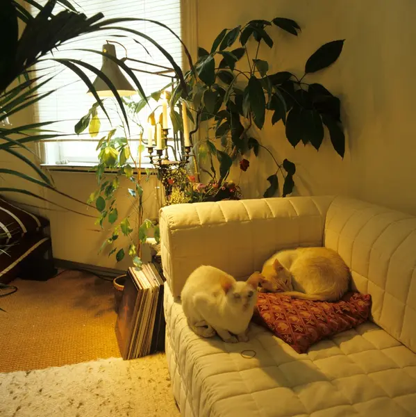 To katter i sofahjørnet i leilighet i gammel bygård på Bislet i Oslo, innredet av grafisk designer Enzo Finger. Illustrasjonsbilde for Bonytt 1983.