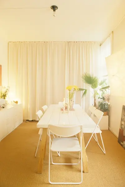 Spisebord av flisebelagt dørblad i leilighet i gammel bygård på Bislett i Oslo. Fotografert for Bonytt 1983.