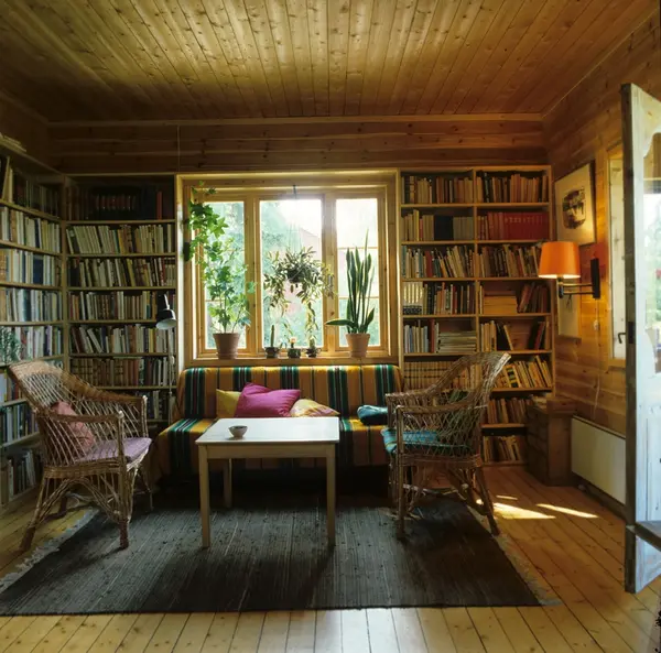 Stue med bokhyller, kurvstol, sofa og bord i enebolig, Nordstrand, Oslo. Illustrasjonsbilde fra Bonytt 1983.