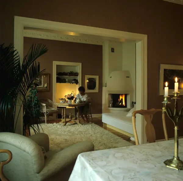 Stue i gammel leilighet på Frogner i Oslo. Dører er fjernet for å gi større romfølelse. Illustrasjonsbilde for Bonytt 1983.