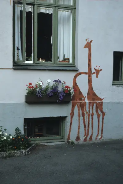 Veggmaleri og blomsterkasse i nyoppusset bakgård på Fagerborg i Oslo. Illustrasjonsbilde for Bonytt 1983.