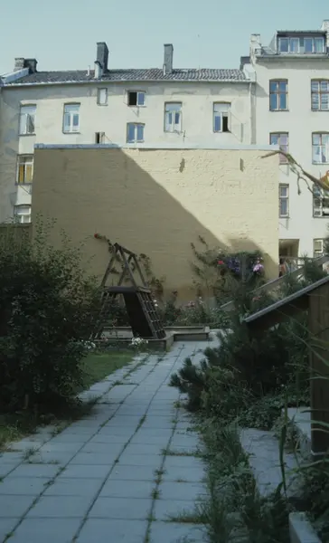 Hellelagt gårdsrom med lekeplass, Sofienberg i Oslo. Illustrasjonsbilde for Bonytt 1983.