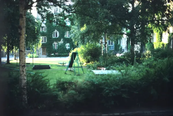 Lekeplass i frodig bakgård i Oslo. Fotografert for Bonytt 1983.