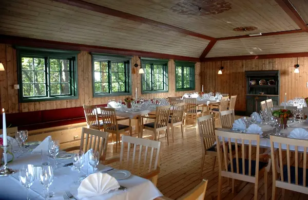 Gjestestuene. Folkestuen på restauranten, Norsk Folkemuseum, 2005. Lokalet pyntet til fest. Dekkede bord.