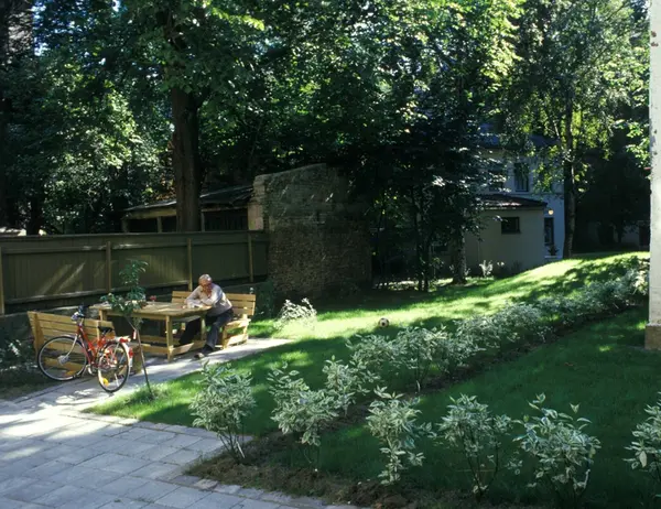 Gårdsrommet i Wessels gate 15 på Meyerløkka i Oslo, etter utbedringene. Sitteplass og nyplanting. Bonytt 3/1985.