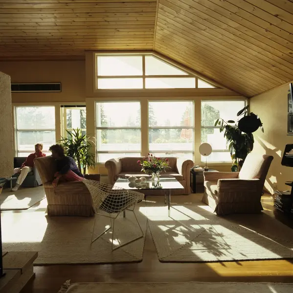 Stuen i kjedet hus bygget i 1982 på Slemdal i Oslo. Arkitekt Christian Malon. Dør til veranda til venstre. Illustrasjonsbilde fra Bonytt 1986.