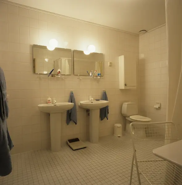 Foreldrebad med to vasker, i hus bygget i 1982 på Slemdal i Oslo. Arkitekt Christian Malon. Illustrasjonsbilde fra Bonytt 1986.