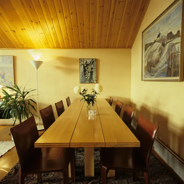 Spisegruppe og lampe i italiensk design, i kjedet hus bygget i 1982 på Slemdal i Oslo. Arkitekt Christian Malon. Illustrasjonsbilde fra Bonytt 1986.