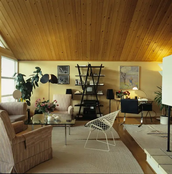 Stue møblert med en blanding av nytt og gammelt, i kjedet hus bygget i 1982 på Slemdal i Oslo. Arkitekt Christian Malon. Illustrasjonsbilde fra Bonytt 1986.