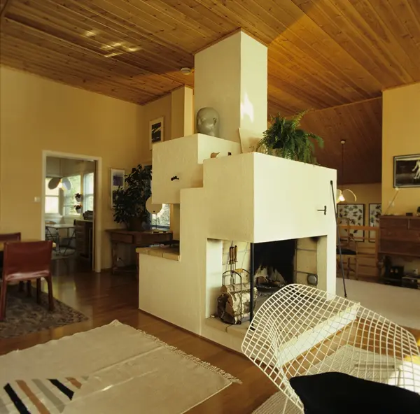 Stueinteriør med tosidig peis, i kjedet hus bygget i 1982 på Slemdal i Oslo. Arkitekt Christian Malon. Illustrasjonsbilde fra Bonytt 1986.