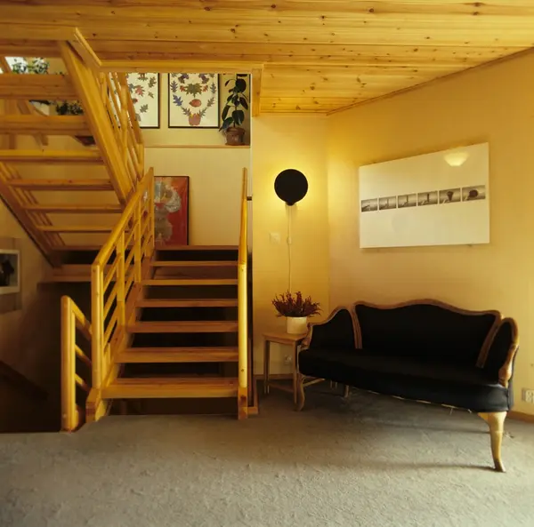 Trappegang i kjedet hus bygget i 1982 på Slemdal i Oslo. Arkitekt Christian Malon. Illustrasjonsbilde fra Bonytt 1986.