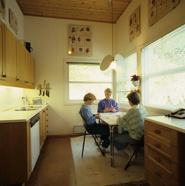 Kjøkken kjedet hus bygget i 1982 på Slemdal i Oslo. Arkitekt Christian Malon. Fotografert for Bonytt 1986.