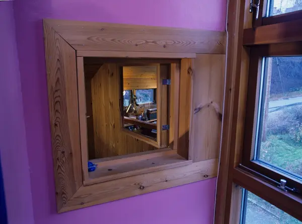 Titteluke, med innsiden kledd med speil, mellom soverom og resten av huset i Vestbyveien 17, Oslo, et prefabrikert "svenskehus" fra 1948, ombygget i 1976. Illustrasjonsbilde fra Bonytt 1986.
