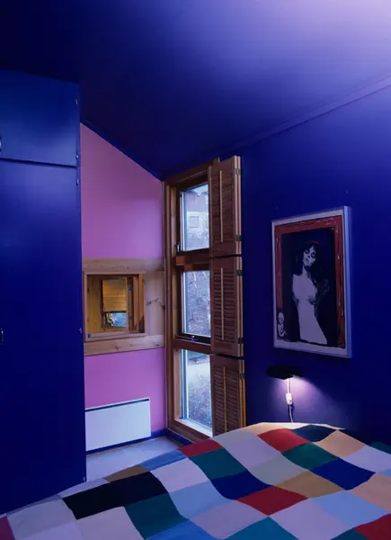 Fargerikt soverom med speilkledd titteluke til arbeidsrommet i Vestbyveien 17, Oslo, et prefabrikert "svenskehus" fra 1948, ombygget i 1976. Illustrasjonsbilde fra Bonytt 1986.