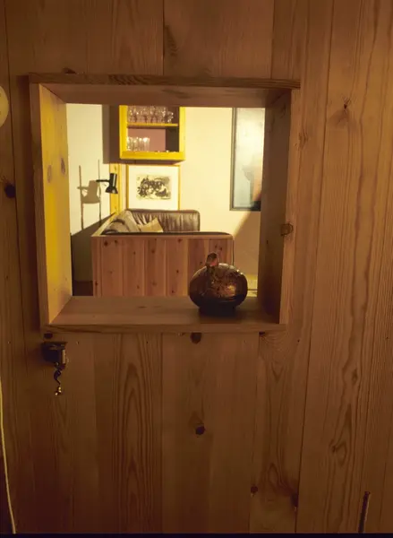 Tittehull mellom stuene i Vestbyveien 17, Oslo, et prefabrikert "svenskehus" fra 1948, ombygget fra 1976. Sofaen kledd med panel på rygg og vanger. Illustrasjonsbilde fra Bonytt 1986.