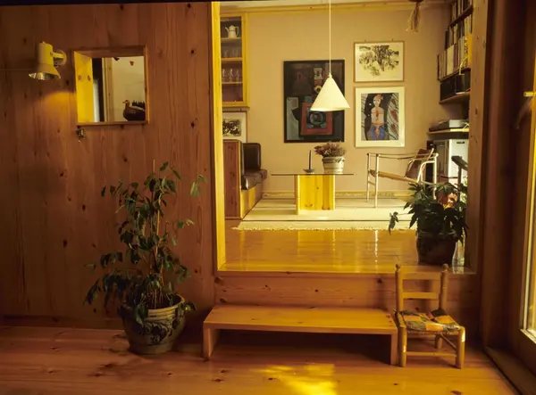Nivåforskjell fra den gamle ned til den nye stuen i Vestbyveien 17, Oslo, et prefabrikert "svenskehus" fra 1948, ombygget i 1976. Illustrasjonsbilde fra Bonytt 1986.
