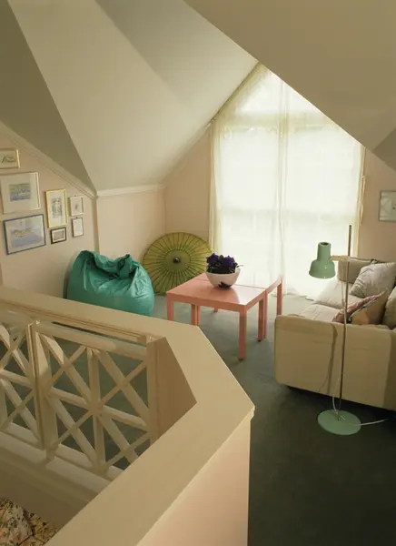 Interiør fra 2. etasje, del av trappeløp, innredningsdetaljer. Saccosekk. Illustrasjonsbilde fra Nye Bonytt 1988.