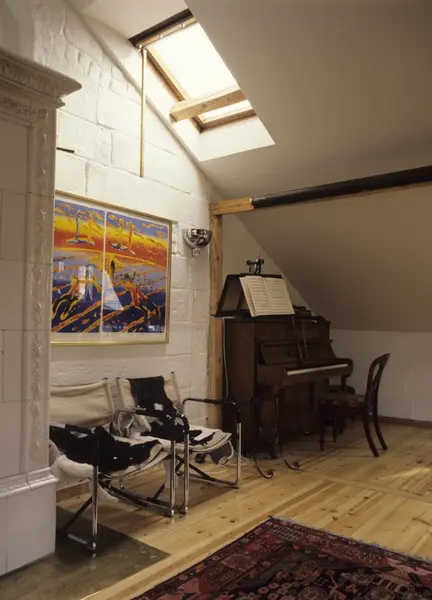 Tårnbygg på Grünerløkka i Oslo, utvidelse av en loftsleilighet, hvitpusset lecamur, Wiederbergbilde på veggen, illustrasjonsbilde fra Nye Bonytt 1988.